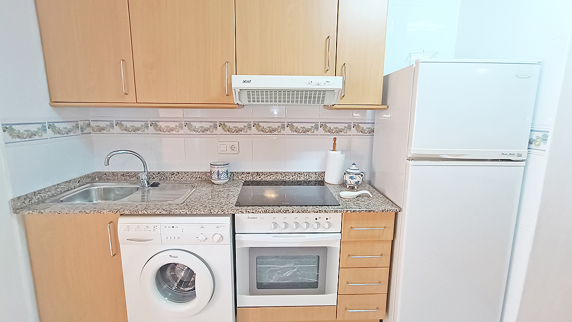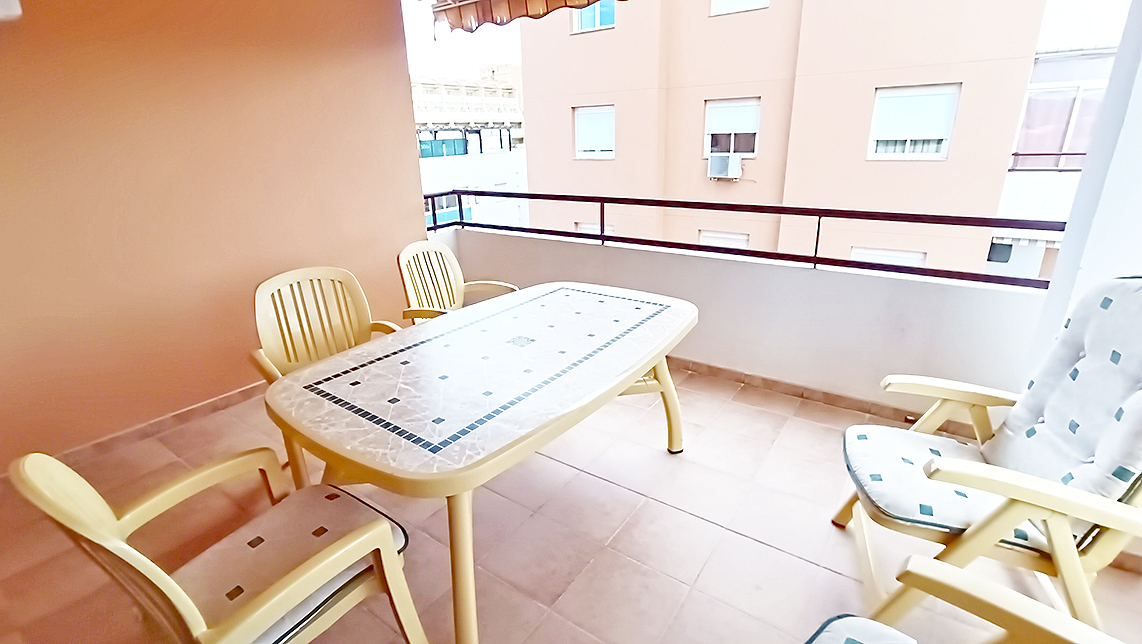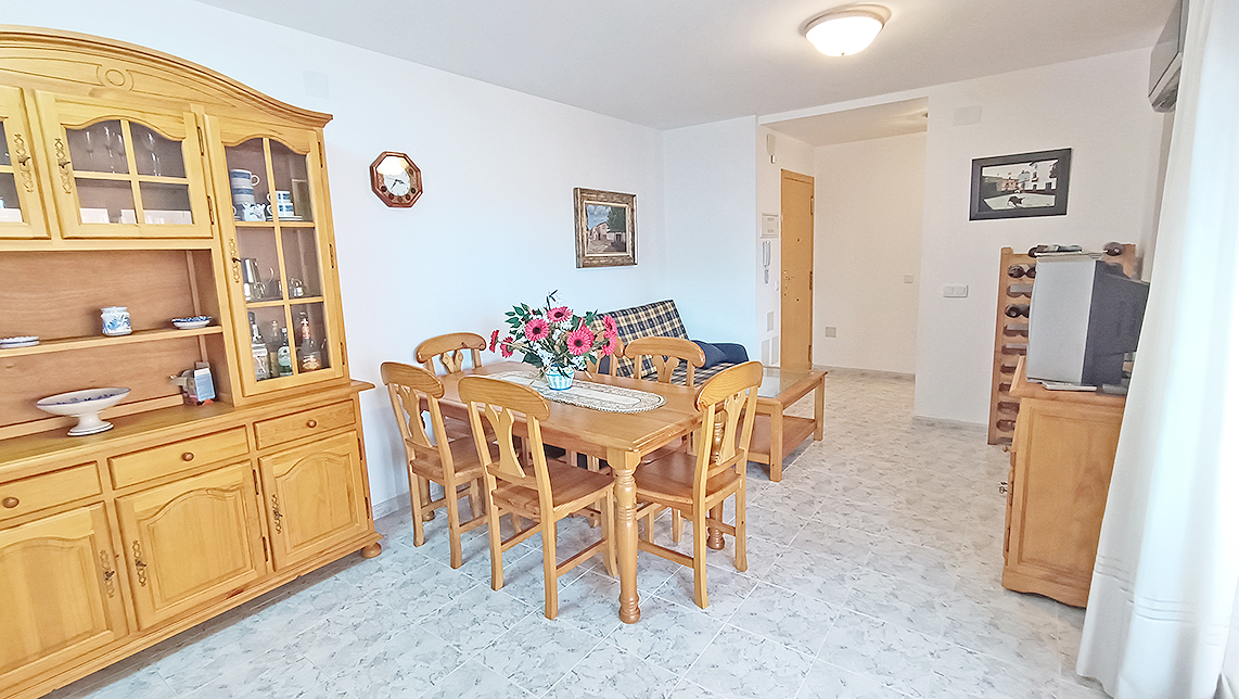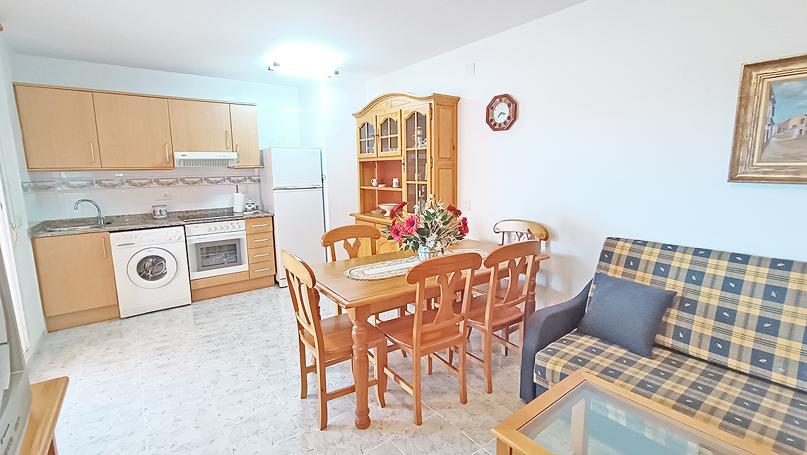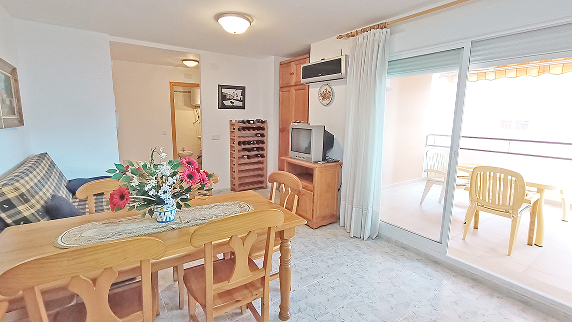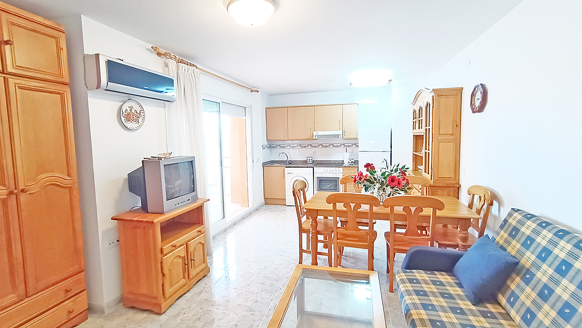 Apartamento de 60 m2, 1 Habitación, 1 baño, salón, cocina americana, terraza, completamente amueblado y equipado, ventanas de aluminio con doble cristal, plaza de parking, trastero, piscina y jardín comunitario, edificio con ascensor, vista a la montaña, en perfecto estado, en la playa.