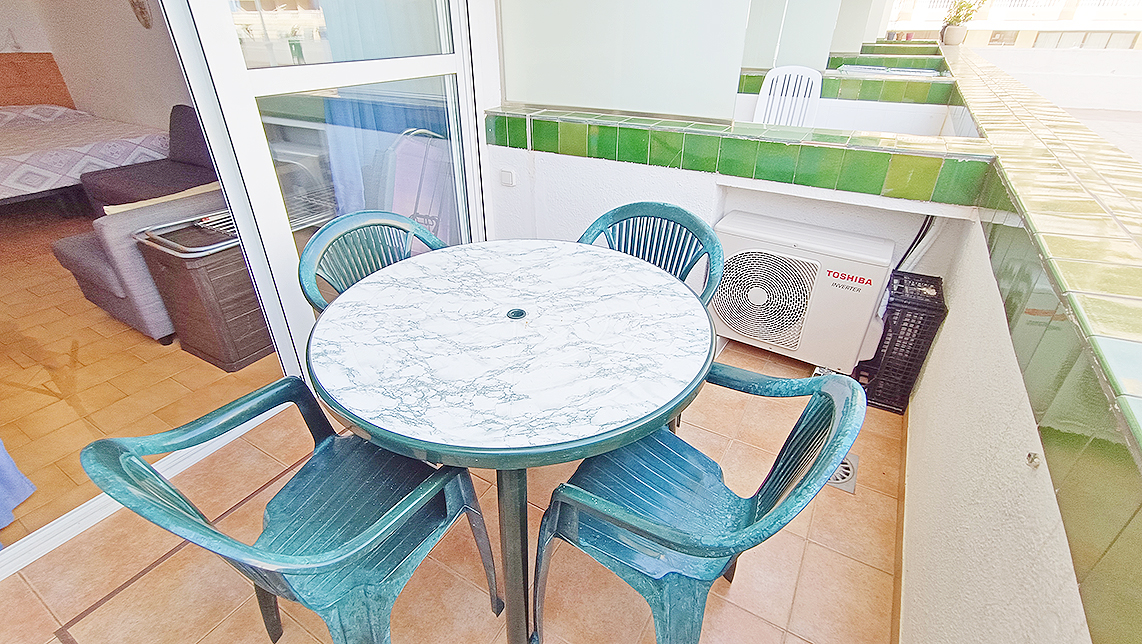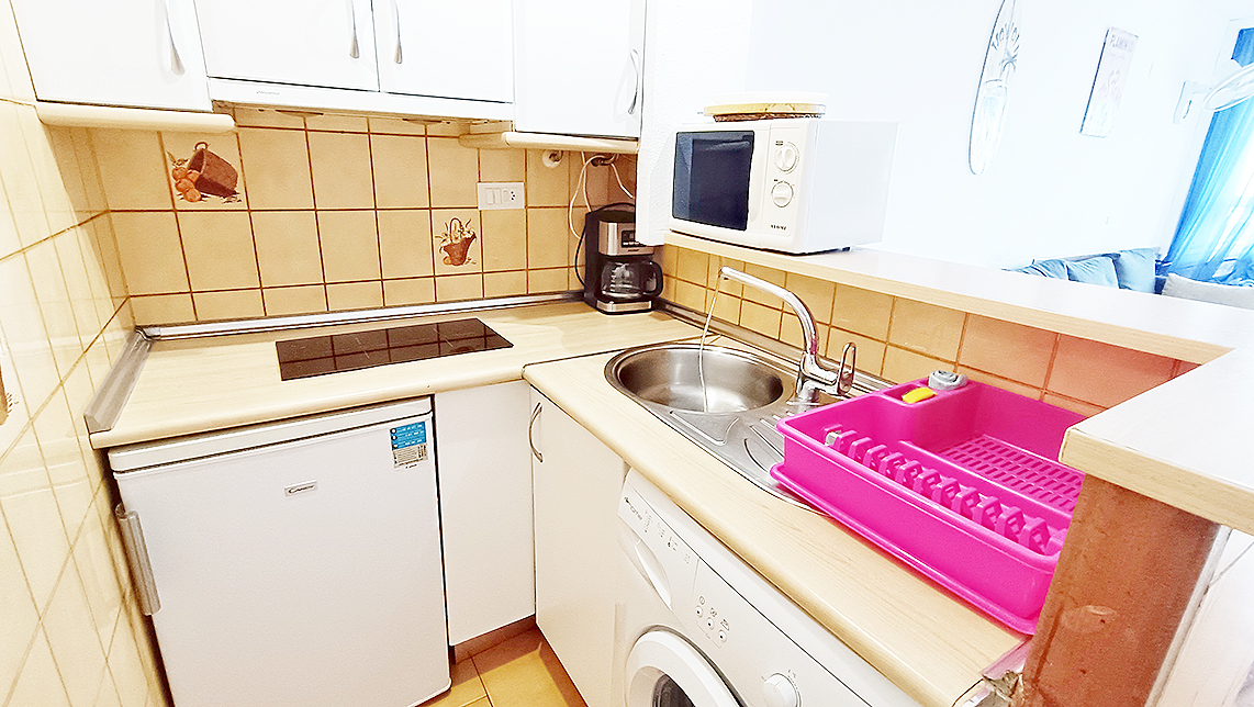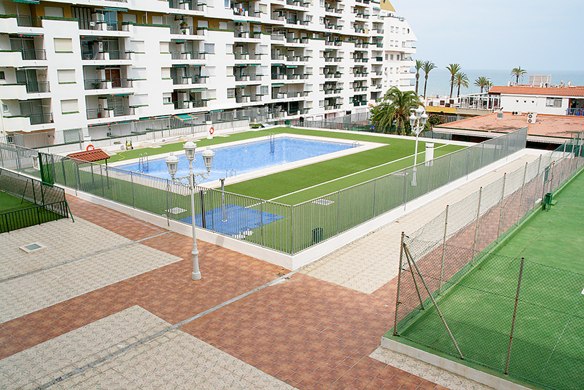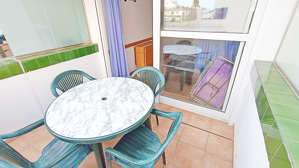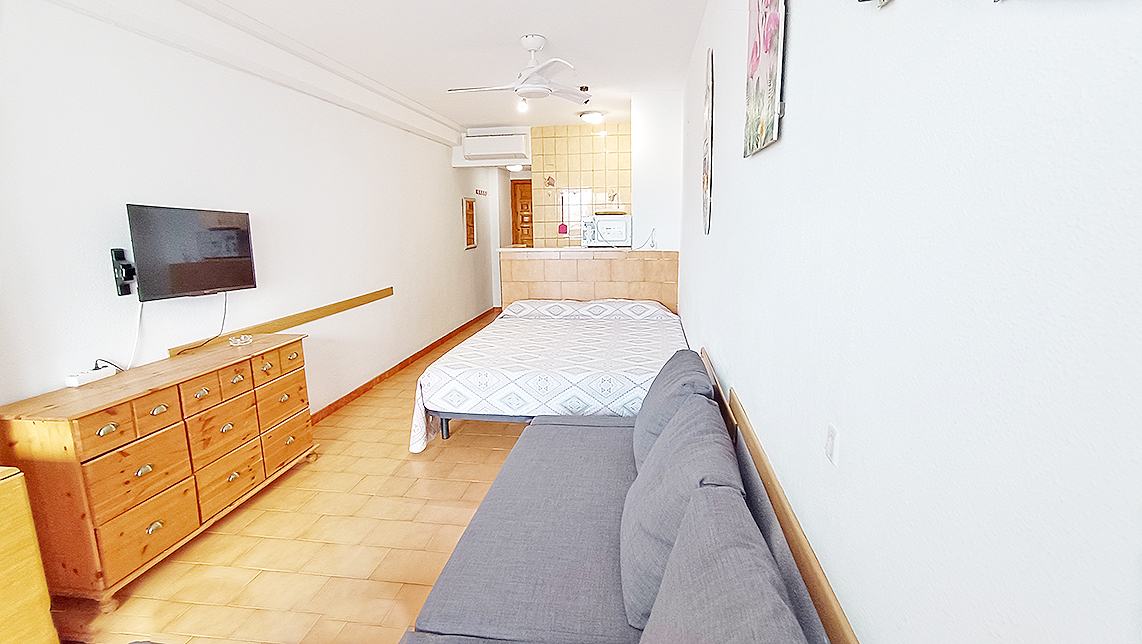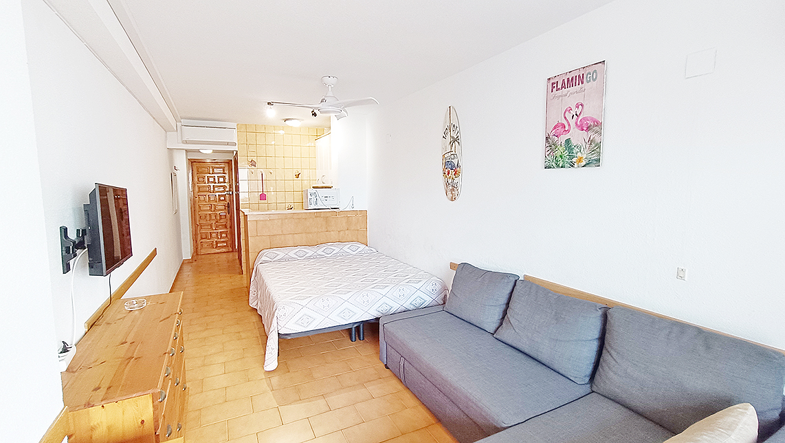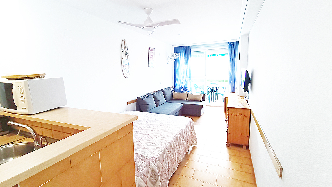 Estudio de 27 m2, 1 baño, salón, cocina americana, terraza, completamente amueblado y equipado, ventanas de aluminio con doble cristal, aire acondicionado, piscina y jardín comunitario, pista de tenis, zona infantil, edificio en primera línea con ascensor, vista al castillo, en buen estado, en la playa.